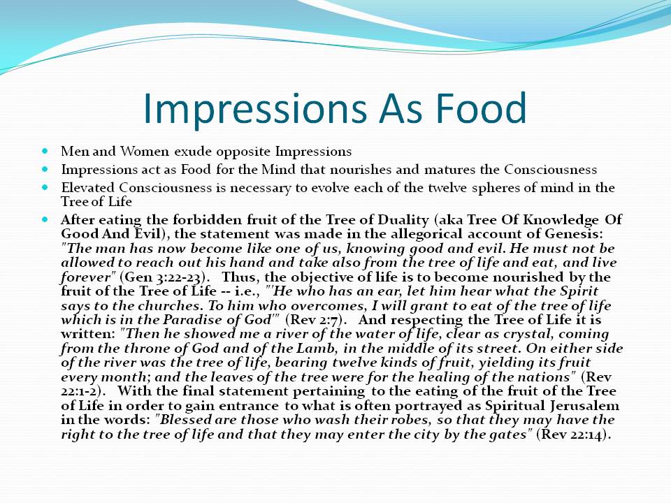 The Tree Of Life: After eating the forbidden fruit of the Tree of Duality (aka Tree Of Knowledge Of Good And Evil), the statement was made in the allegorical account of Genesis: "The man has now become like one of us, knowing good and evil. He must not be allowed to reach out his hand and take also from the tree of life and eat, and live forever" (Gen 3:22-23).  Thus, the objective of life is to become nourished by the fruit of the Tree of Life -- i.e., "'He who has an ear, let him hear what the Spirit says to the churches. To him who overcomes, I will grant to eat of the tree of life which is in the Paradise of God'" (Rev 2:7).   And respecting the Tree of Life it is written: "Then he showed me a river of the water of life, clear as crystal, coming from the throne of God and of the Lamb, in the middle of its street. On either side of the river was the tree of life, bearing twelve kinds of fruit, yielding its fruit every month; and the leaves of the tree were for the healing of the nations" (Rev 22:1-2).   With the final statement pertaining to the eating of the fruit of the Tree of Life in order to gain entrance to what is often portrayed as Spiritual Jerusalem in the words: "Blessed are those who wash their robes, so that they may have the right to the tree of life and that they may enter the city by the gates" (Rev 22:14).  The problem is seen in the fact that after suppressing the higher spiritual knowledge of Jesus and TheWay, modern seekers have no idea what the Tree of Life is, or how to be nourished by its fruit.