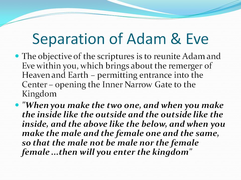 The Gate Of Eden: Why were the Nazirene/Ebionites vegetarian?  Why did they live in accordance with the precepts of the Torah/Law?  Why did they live separate and apart from both Jews and Christians?  The answer is very simple: The Gate of Eden is within us, and if we fail to enter therein while we are still physically alive in the body, we will have failed in our opportunity to enter into Life.  And while it can be countered that we are saved by our belief in Messiah/Christ, faith, or the blood of the lamb, the truth is that if we were truly faithful disciples of TheWay, that we would experience the opening of the inner door and the Kingdom coming within us.  The GateOfEden article explores all aspects of the need to pick up one's own cross and follow the narrow path that leads to the inner gate to the Edenic Kingdom of Origination.