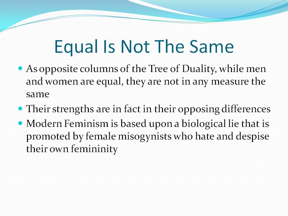 Lilith - The Demonic Reality Of Feminism: In the Divine Pattern of Creation man and woman are not only equal, but the mental/spiritual level of one polarity directly affects and limits the other.  The spiritual ignorance of many religious groups today is directly in proportion to the failure of men and women to interact and move into a state of spiritual harmony and balance.